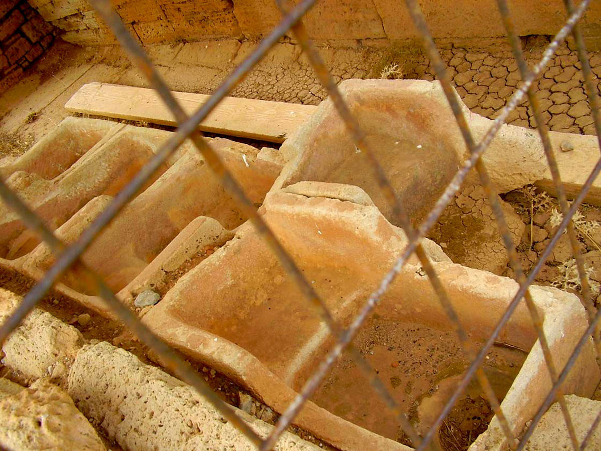 The necropolis is situated outside the city walls and covers a large area south and east of the harbour. It dates from the Archaic and Hellenistic periods. The tomb types include pithos burials, pit graves, cist graves and rock-cut graves.