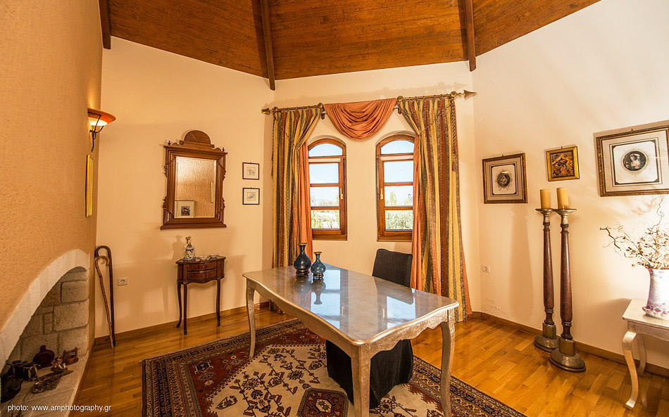 – Lounging area with a fireplace, a dining room which sits up to 12 people.